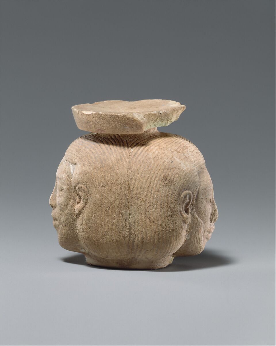 This perfume vase formed of two heads with Egyptianizing wiglike hair was probably made at Naukratis, a Greek trading station in the Nile Delta.