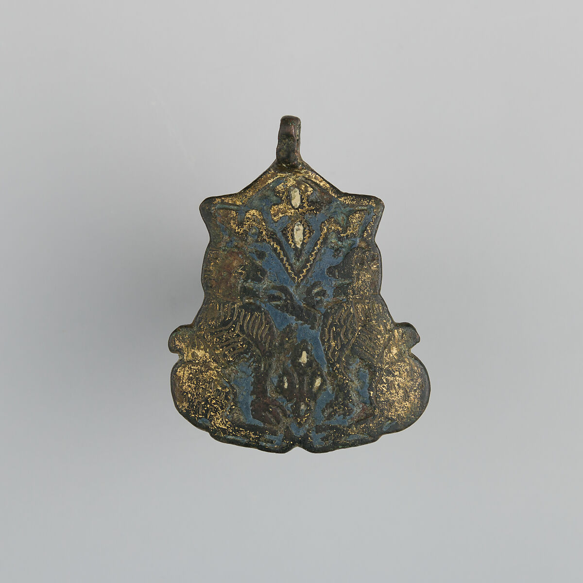 Heraldry, or coat-of-arms, were vitally important in Europe throughout the Middle Ages and the Renaissance. Heraldic emblems were used to identify noble families, cities, regions, and even countries. In addition to being displayed on shields and flags, heraldry was incorporated into architectural decoration on the interior and the exterior of buildings, on furniture, works of art, clothing, and horse equipment. Harness pendants, like this example, would have been attached to a headstall, bridle, or other straps making up the tack of a horse ridden by a nobleman or noblewoman, or a member of their household. Many harness pendants also have decoration that is simply ornamental, or have symbols that are not specifically heraldic in nature.