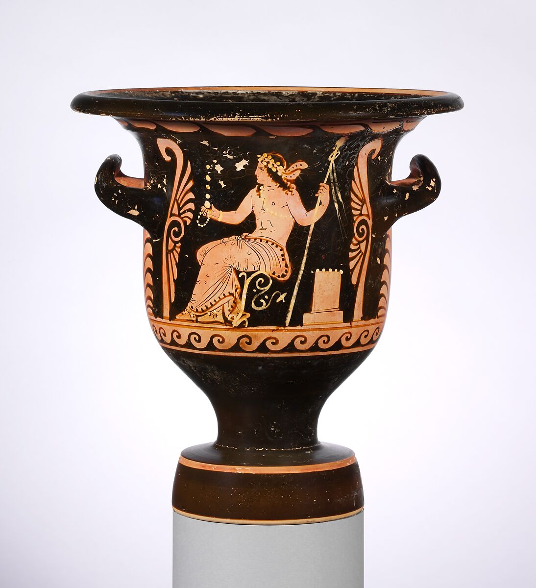 The two sides of the vase are complementary: Dionysos receiving the offering from his satyr-attendant. The depiction of the wine god as a handsome youth is thoroughly South Italian. His special quality is further emphasized in that a tendril suffices to support his weight.