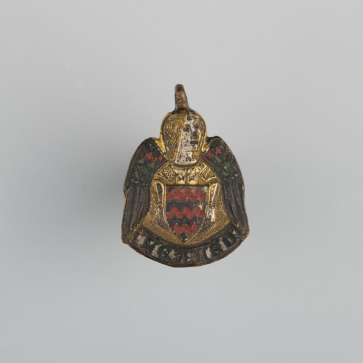 Heraldry, or coat-of-arms, were vitally important in Europe throughout the Middle Ages and the Renaissance. Heraldic emblems were used to identify noble families, cities, regions, and even countries. In addition to being displayed on shields and flags, heraldry was incorporated into architectural decoration on the interior and the exterior of buildings, on furniture, works of art, clothing, and horse equipment. Harness pendants, like this example, would have been attached to a headstall, bridle, or other straps making up the tack of a horse ridden by a nobleman or noblewoman, or a member of their household. Many harness pendants also have decoration that is simply ornamental, or have symbols that are not specifically heraldic in nature.