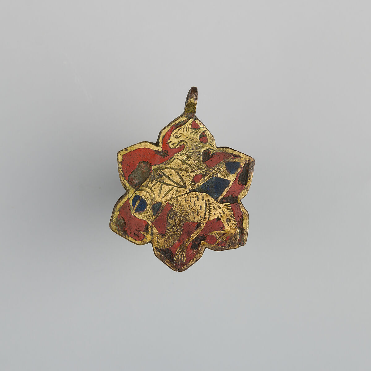 Heraldry, or coat-of-arms, were vitally important in Europe throughout the Middle Ages and the Renaissance. Heraldic emblems were used to identify noble families, cities, regions, and even countries. In addition to being displayed on shields and flags, heraldry was incorporated into architectural decoration on the interior and the exterior of buildings, on furniture, works of art, clothing, and horse equipment. Harness pendants, like this example, would have been attached to a headstall, bridle, or other straps making up the tack of a horse ridden by a nobleman or noblewoman, or a member of their household. Many harness pendants also have decoration that is simply ornamental, or have symbols that are not specifically heraldic in nature.