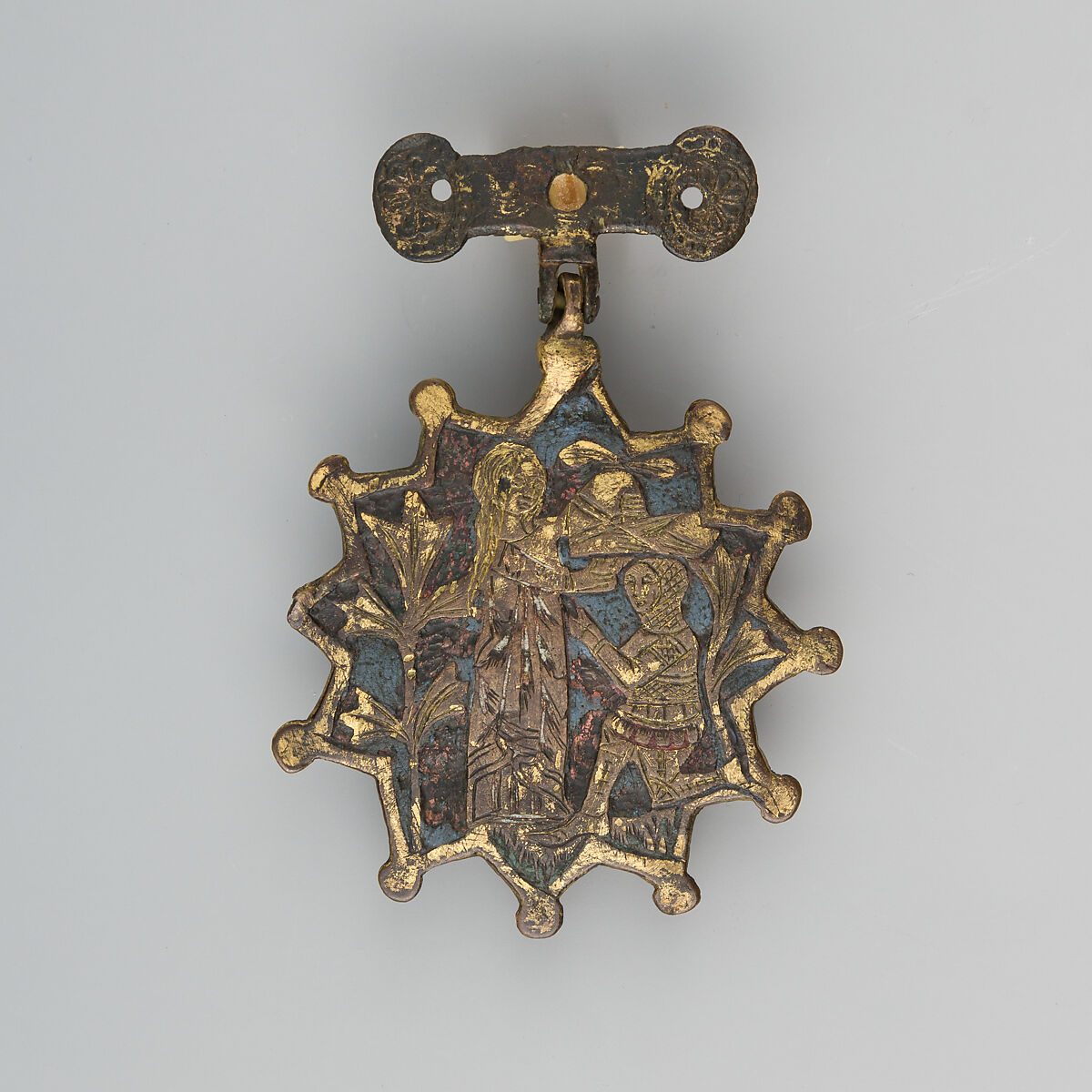 Heraldry, or coat-of-arms, were vitally important in Europe throughout the Middle Ages and the Renaissance. Heraldic emblems were used to identify noble families, cities, regions, and even countries. In addition to being displayed on shields and flags, heraldry was incorporated into architectural decoration on the interior and the exterior of buildings, on furniture, works of art, clothing, and horse equipment. Harness pendants, like this example, would have been attached to a headstall, bridle, or other straps making up the tack of a horse ridden by a nobleman or noblewoman, or a member of their household. Many harness pendants also have decoration that is simply ornamental, or have symbols that are not specifically heraldic in nature.