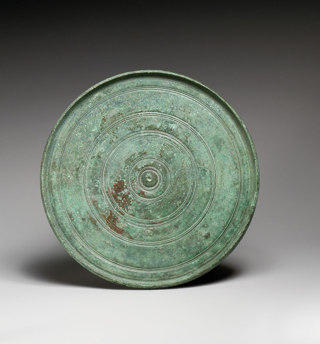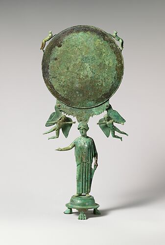 The mirror was reportedly found with the bronze perirrhanterion (sprinkler) that is displayed in the main Greek galleries.