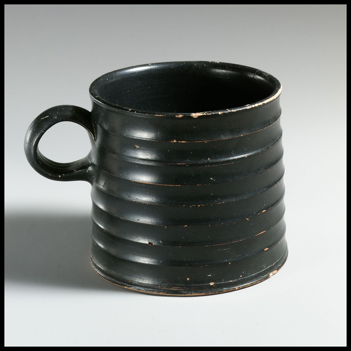 This form of ribbed mug is known in both Attic and South Italian fabrics that are often difficult to distinguish.
