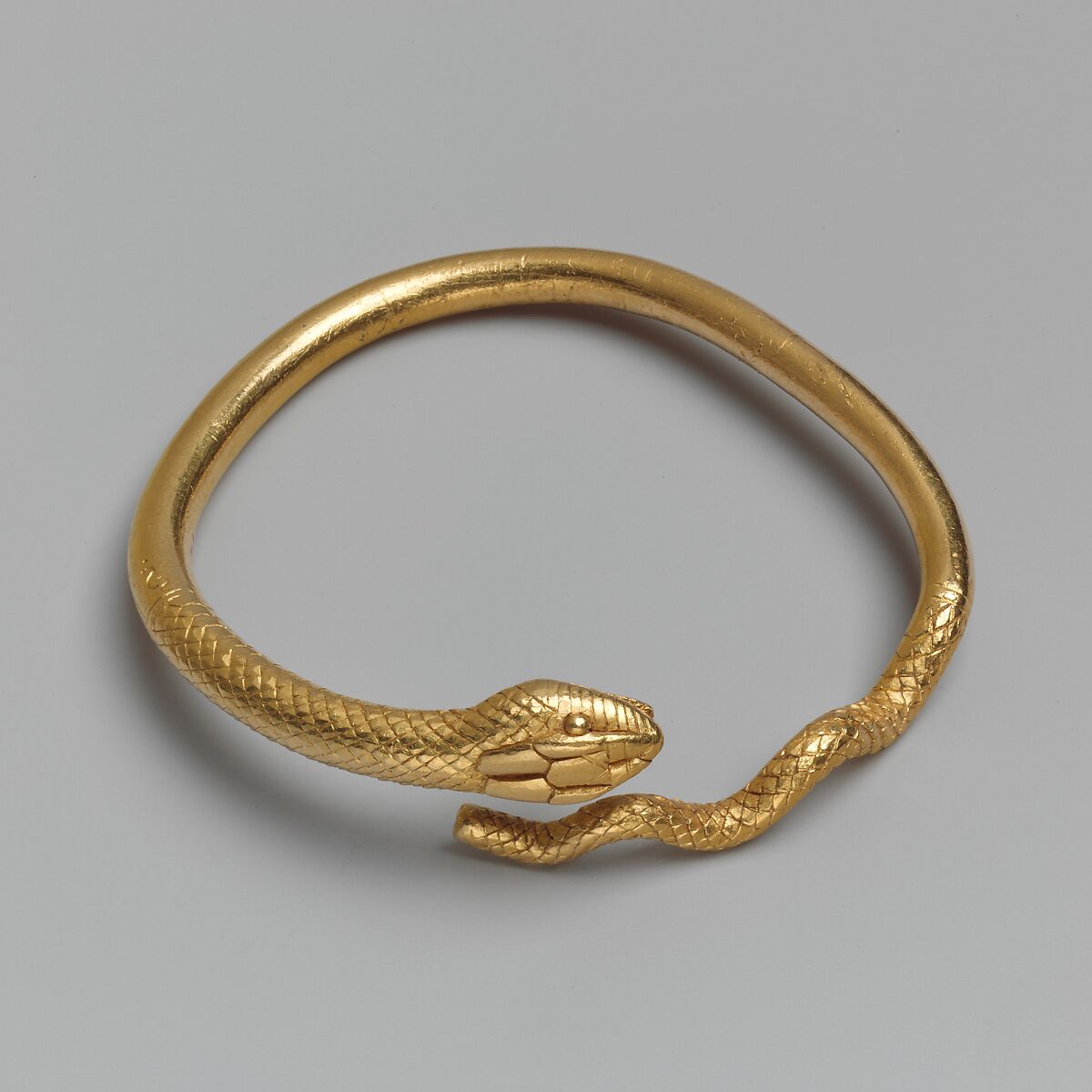This massive bracelet or armlet is cast in solid gold. The scales and details of the snake's head were chased after casting.