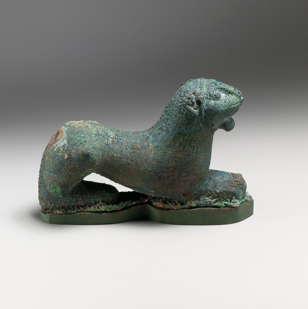 These three solid-cast lions are said to have been found together. Certainly they are closely related both in style and technique of manufacture. They likely ornamented a larger object, perhaps a brazier, which was almost certainly made of iron, since fragments of iron plate and several iron rivets remain attached to the bronze lions.