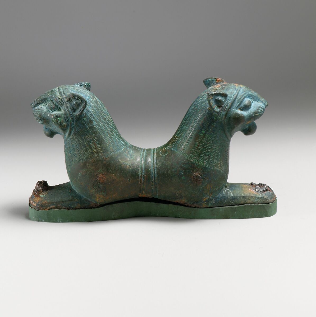 These three solid-cast lions are said to have been found together. Certainly they are closely related both in style and technique of manufacture. They likely ornamented a larger object, perhaps a brazier, which was almost certainly made of iron, since fragments of iron plate and several iron rivets remain attached to the bronze lions.