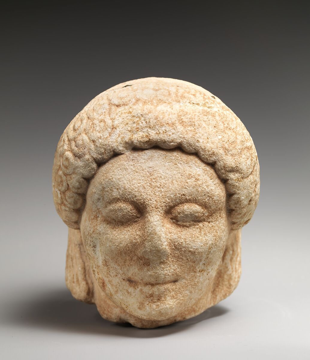 Owing to the worn surface, it is difficult to identify the figure as male or female. However, the hairstyle in which the hair on the nape of the neck is looped up over a band, the holes indicating the original existence of an added bronze band—probably a wreath—and the absence of earrings suggest a young man. The soft fullness of the physiognomy indicates an Island workshop in the northern Aegean Sea.