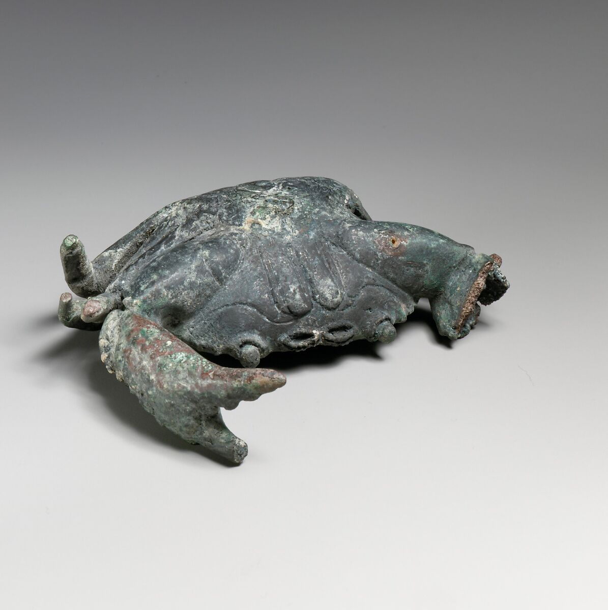 The hole at the top of the carapace indicates that the crab served as a furniture attachment or as a base, possibly for a lamp. The naturalistic articulation presupposes firsthand observation of a live specimen.