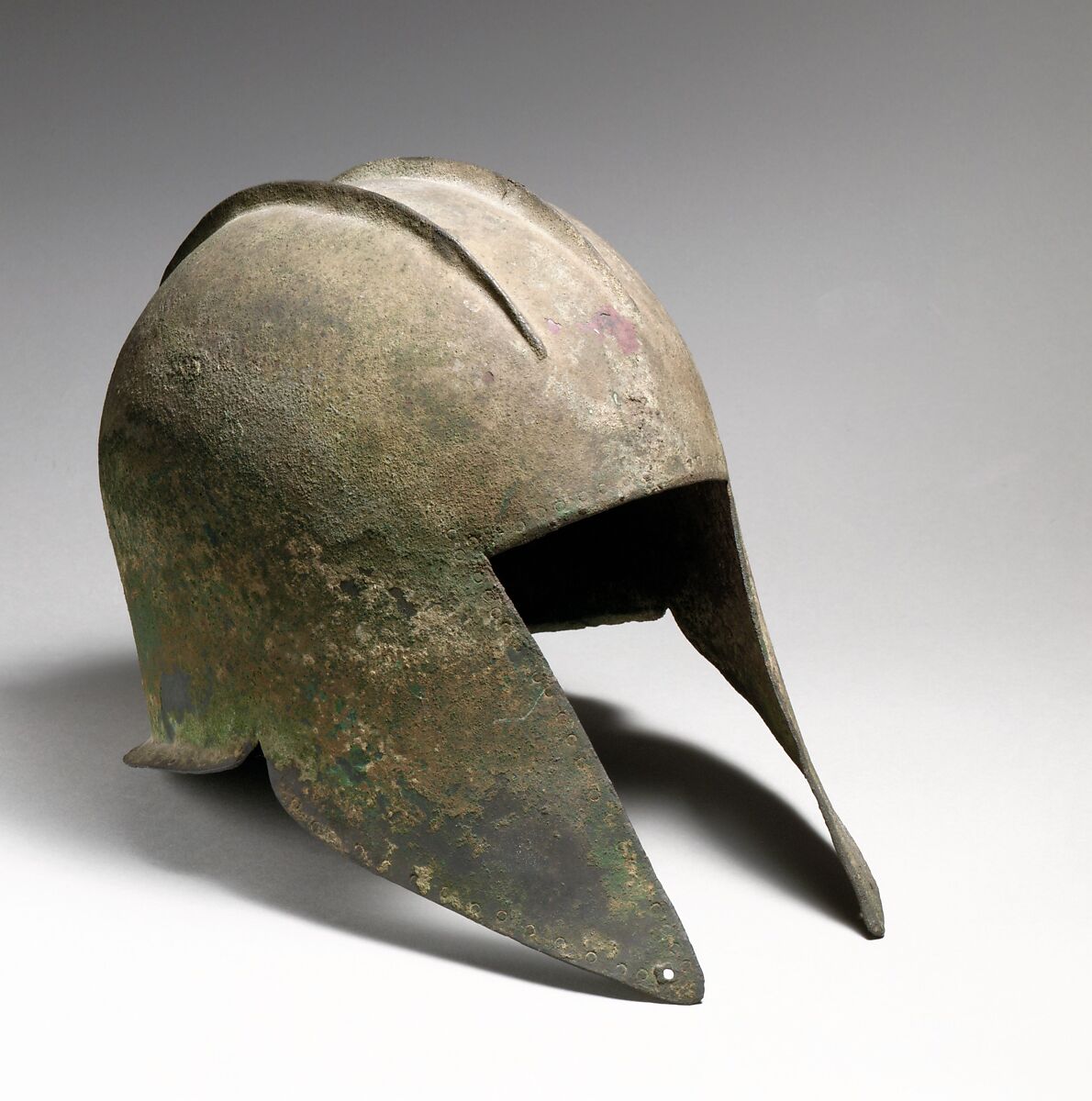 In the Illyrian helmet, the opening for the face is rectilinear, with a horizontal line at the forehead and two verticals at the inner edges of the cheekpieces. Two parallel ridges on the crown frame the crest.