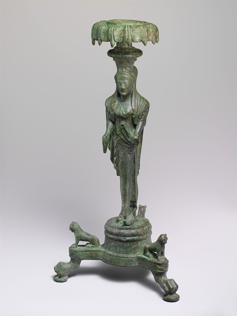 The calyx-shaped receptacle on the woman's head was probably originally surmounted by a shaft. Utensils incorporating human figures as supports or handles were as popular in Etruria as in Greece. This incense burner is exceptional, not only for the rendering of the woman, who is both statuesque and decorative, but also for the manner in which every part emphasizes her three-dimensionality.