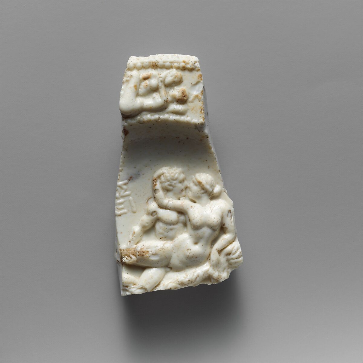 This fragment is highly unusual not only in its erotic subject matter but also in having the maker’s signature, which is now only partly preserved in Greek letters to the left of the central pair of lovemakers. Other couples decorate the rim and the center of the exterior of the bowl. Together with a fragment from the same mold in the British Museum, it is the only example of a cast or pressed glass vessel with relief decoration on both sides.
