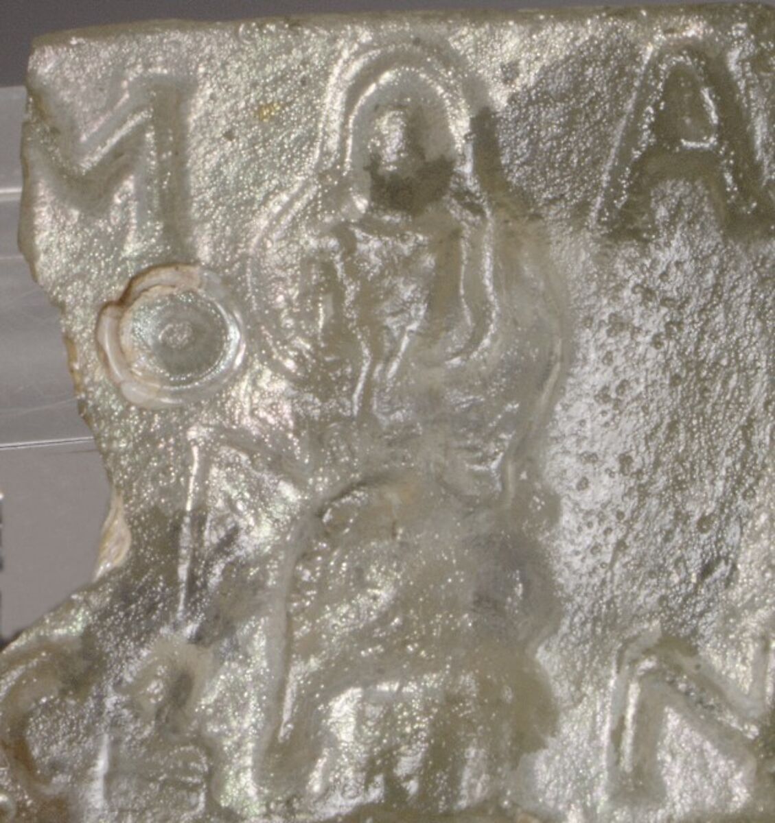 This base fragment has an impression of the stamp that was carved into the mold. It depicts a draped and veiled figure seated on an armchair. Flanking the figure are the letters MACN, the meaning of which remains unclear.