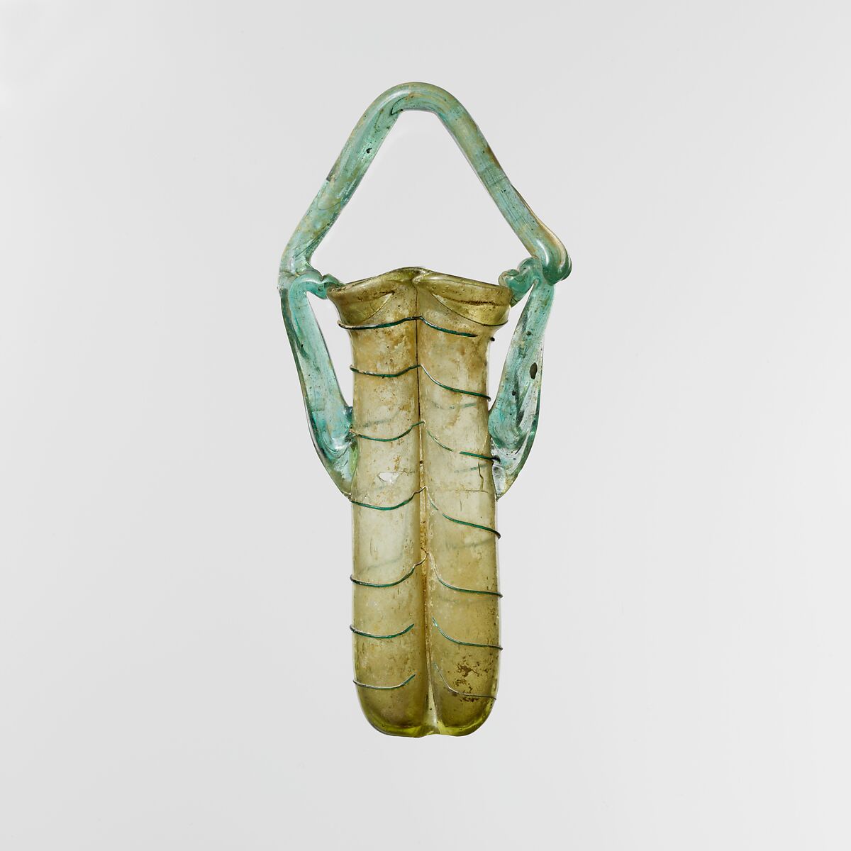 Rim folded in and down sides of neck; body comprising two tubes, side by side, made from a single inflated gather by pinching sides vertically to make diaphragm; pontil mark on bottom; basket handle made from three separate rods, two attached to side of body over trail, drawn up and outward, then turned sharply in and dropped onto rim, the third rod then applied to top of one handle, drawn up and down, with acute angle at apex, and attached to top of other handle.