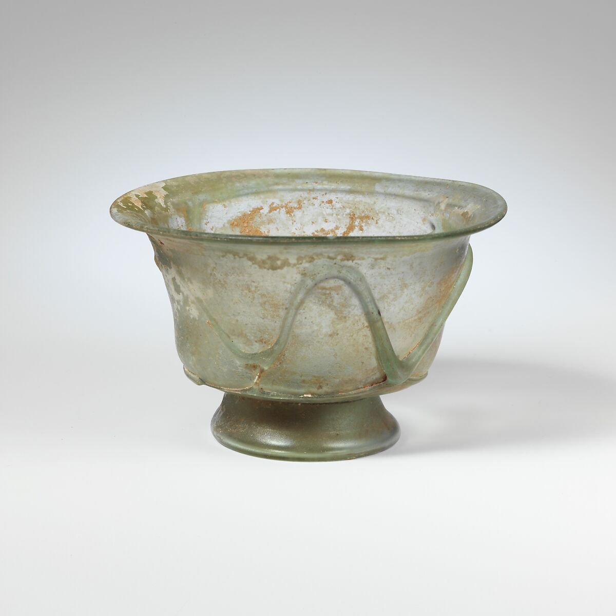 Outsplayed rim, with rounded lip; side of body tapers downwards, then curves inwards; tall, splayed tubular foot, made by folding; thick, conical bottom, flattened at center by pontil mark.