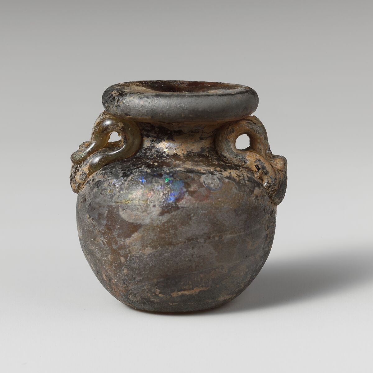 Rim folded out, over, and in, forming small, central mouth; short, concave neck; squat, globular body; thick bottom with kick and large pontil scar; two handles applied in large pads to upper body, each drawn up side and neck, and folded out and down over itself.