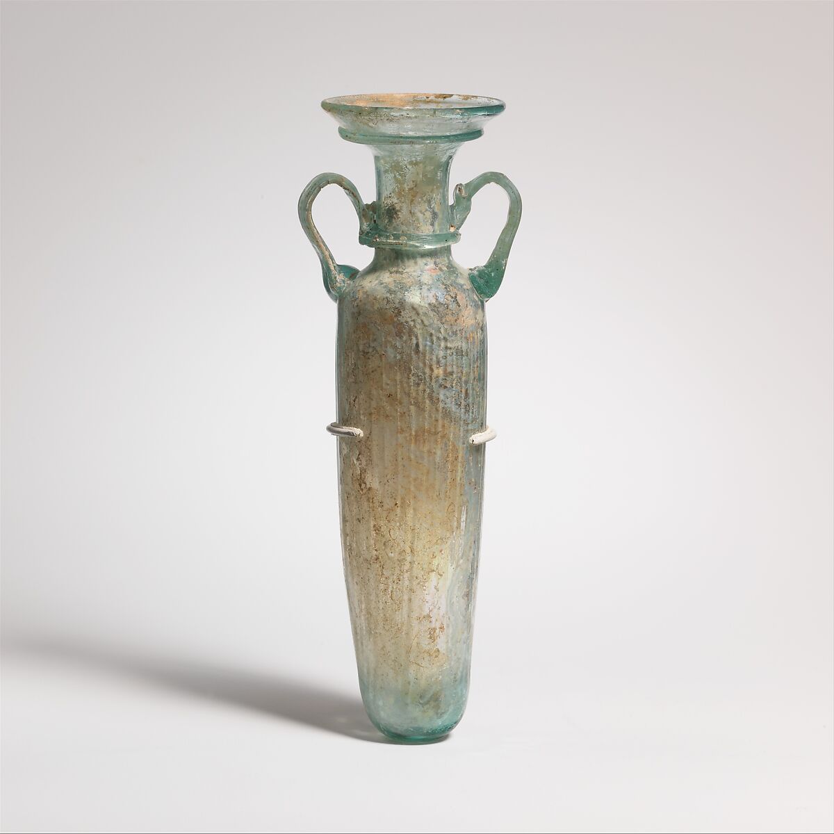 Rounded rim; flaring mouth; cylindrical neck; narrow sloping shoulder; tall, cylindrical body with slightly convex side; thick rounded bottom with deep pontil scar; two handles applied in pads to edge of shoulder, drawn up and outwards, then turned down and trailed onto neck above trail decoration.