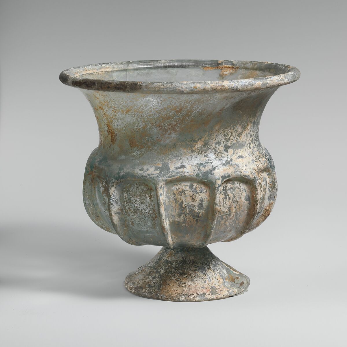 This cup or chalice bears a similarity to the ribbed bowls also displayed here (91.1.1247, .1346), but the treatment of the rim and the addition of the foot make it a very unusual example of Roman blown glass tableware.