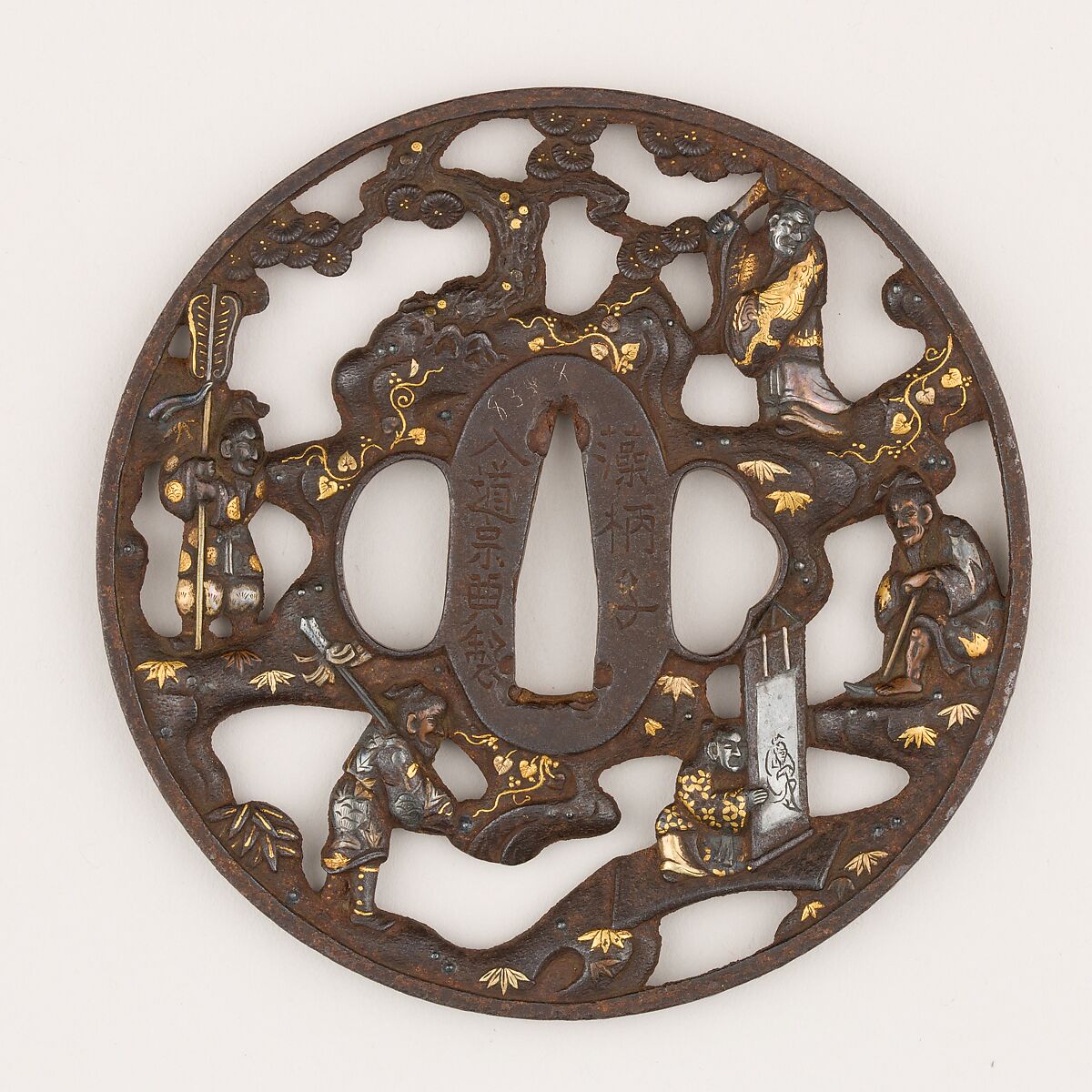 This Sōten (宗典) School tsuba shows five Chinese figures in three-dimensional openwork (nikubori ji-sukashi) which are colored in gold, silver, copper, and shakudō. One person is getting portrayed by a painter and the remaining three appear to carry standards which suggests that they are retainers of the sitting person that is portrayed. Although set in a pine grove, the motif may represent that of The Seven Sages in the Bamboo Grove (Chikurin no shichiken, 竹林七賢) which is frequently found on works from this school.