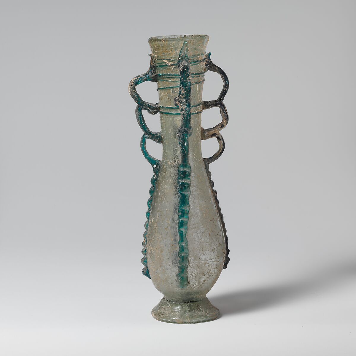 Slightly thickened, rounded, vertical rim; slender funnel-shaped neck; elongated piriform body; splayed, tubular foot, made by folding; small, convex bottom with central hollow containing pontil pad; four handles applied as long vertical trails, evenly spaced around body, drawn up to top of body, then tooled out into three vertical loops, and trailed off on neck towards rim.