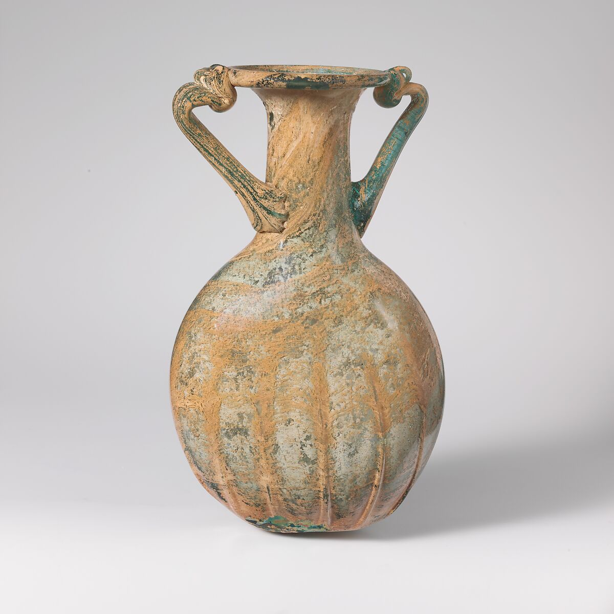 Thick, outsplayed, tubular rim, folded over and into shallow flaring mouth; cylindrical neck; lentoid body with rounded sides; thick, narrow oval bottom, slightly concave, with central pontil scar; two rod handles applied as large claw-like pads on lower neck, twisted round, up and outwards, tooled in with a downward fold, attached to edge of rim, and tooled off above.