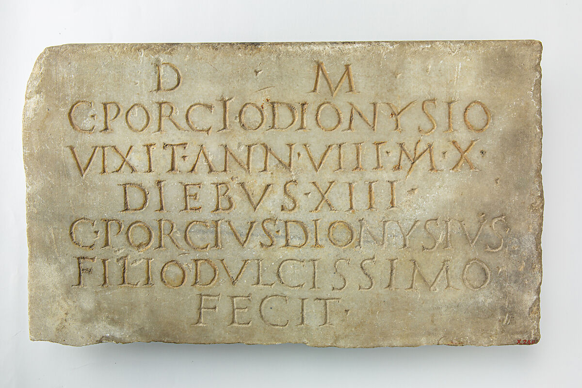 The Latin inscription probably comes from a columbarium, a communal chamber tomb. It reads: "To the spirits of the dead. For C. Porcius Dionysius, who lived 8 years, 10 months, and 13 days. C. Porcius Dionysius made [this] for the sweetest of sons." The boy, who was clearly named after his father, died first, exemplifying the high rate of child mortality in antiquity.