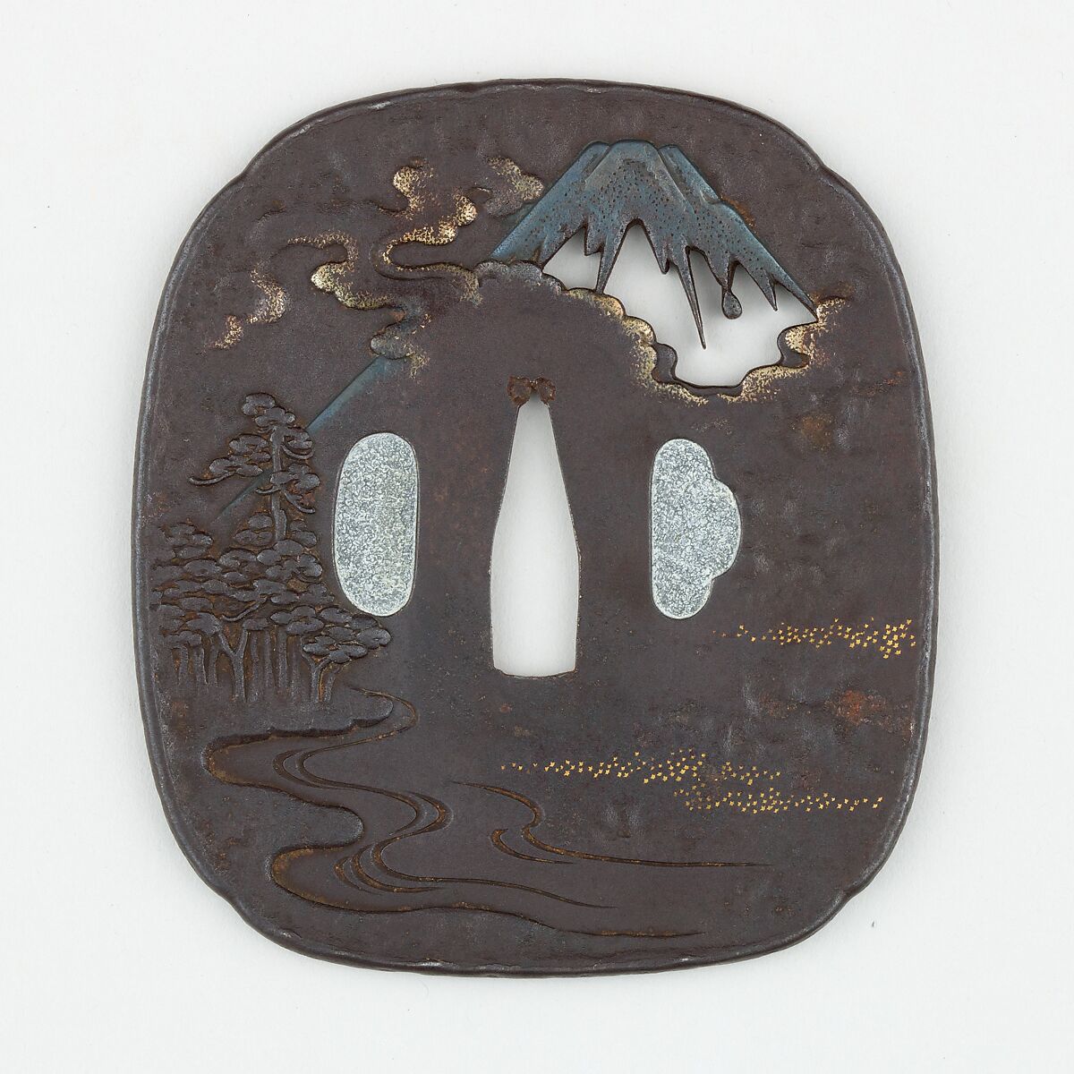 This tsuba depicts the Pine Grove at Miho (Japanese: Miho no Matsubara), a scenic area on the Miho Peninsula renowned for its seashore with pine trees, seen on the right of the obverse, and view of Mt. Fuji, which is depicted peeking from behind clouds, using openwork for the mountain flanks and a shibuichi for the snow cover. The Pine Grove at Miho is also known as the site of the legend of Hagoromo (羽衣, "The Feathered Robe"), which is based on the traditional swan maiden motif. The reverse shows engravings of rice paddies and flying wild geese highlighted in gold.