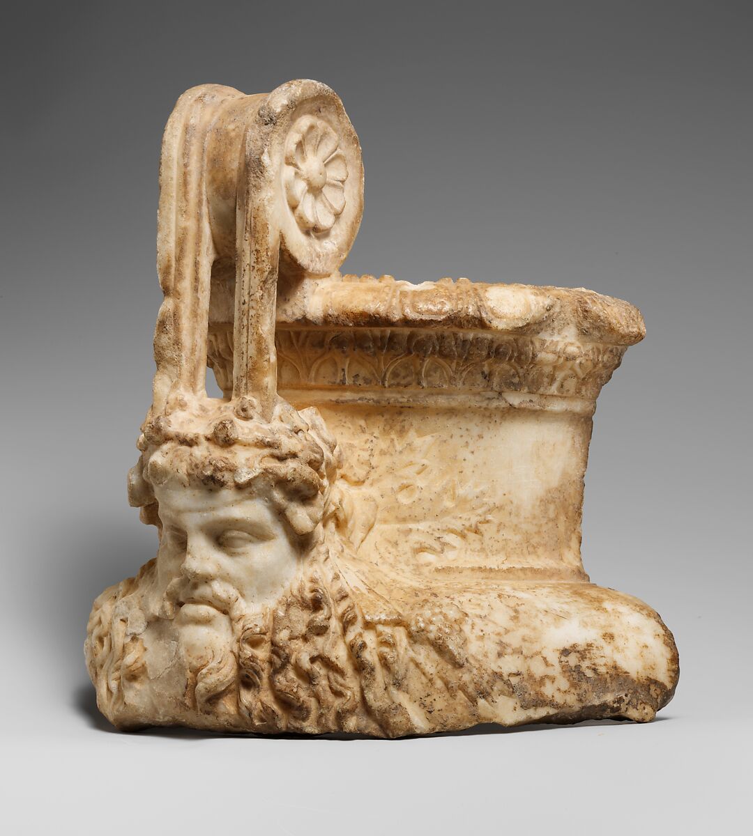 Large marble vases carved with figured reliefs are among the most spectacular objects produced in workshops that specialized in classicizing works for a sophisticated Roman clientele. This fragment includes one handle and part of the neck and shoulder of a volute krater that once must have decorated a Roman garden. A large mask of a bearded Dionysus adorns the base of the handle, while grape leaves carved in low relief spread out behind it.