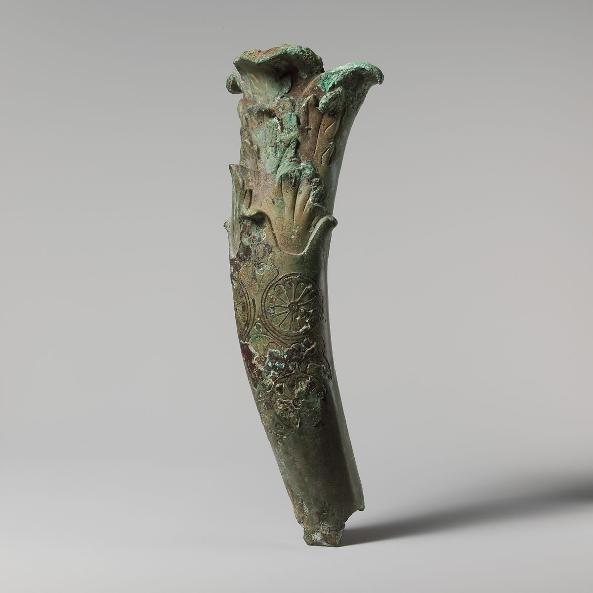 Although the object’s function is uncertain, it clearly forms part of a richly decorated ornament. Below the acanthus fronds is a series of rosettes, inlaid with silver, niello, and copper.
