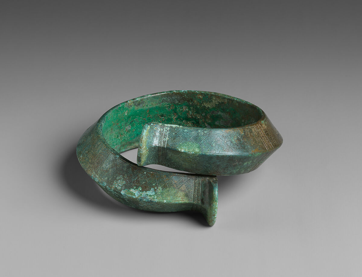 The heavy armlet belongs to the group of the so-called Macedonian bronzes, a wide range of bronze ornaments made in the northwest Aegean and south-central Balkans (late 8th-early 5th c. BCE), mostly found in elite female tombs. Though an autonomous stylistic group, Macedonian bronzes present strong artistic connections with the neighboring Hallstatt culture of central Europe and were influenced by the Greek presence in the south (notably Thessaly and Corinth).