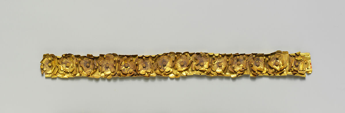 Fourteen rosettes are attached to a single band of gold that has scalloped and turned-up edges. The petals are secured in the center by a granulated sphere. The balls that emerge on short wires from between the petals of each flower are granulated on alternating rosettes.