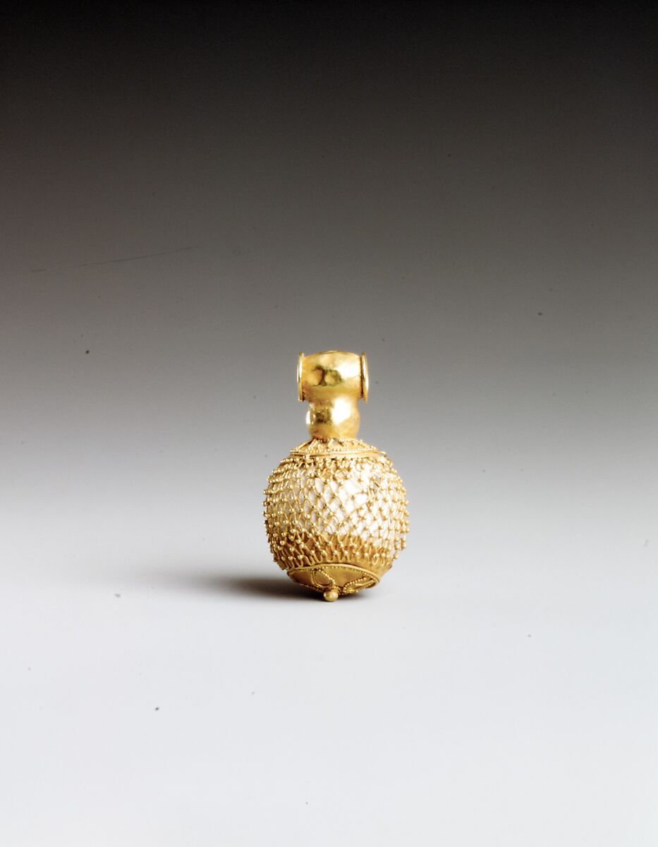 This artwork was restituted in September 2025. It is no longer in the museum’s collection.Pendant globe. A large white globe of lime mortar, evidently intended to imitate a large sea pearl, is enclosed in a gold wire net fused with granulation and constructed of rows of plain wire laid in a zigzag pattern.