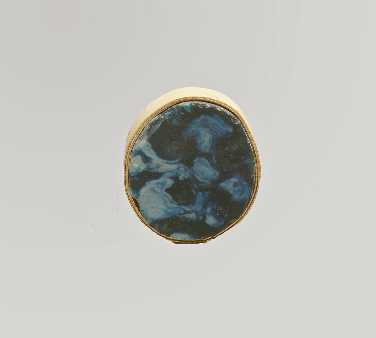 Marbled mosaic pattern in a black ground with mixed blue and white swirls.