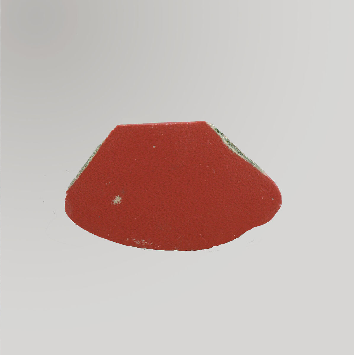 Part of the flat bottom of a dish with a low base ring on the exterior. The opaque red color was very popular and appears on numerous examples of Roman cast monochrome glass. The surface often appears as a weathered green color because the copper, added to the glass to give it its vivid red color, has leeched out over time.