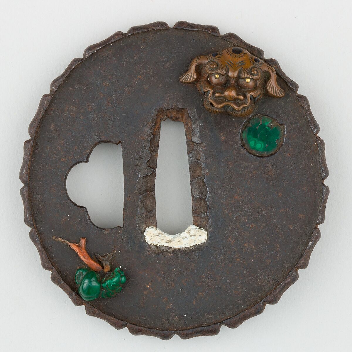 This tsuba shows what appears to be an arrangement of masks (men, 面), with a copper lion mask on the obverse and a fox mask on the reverse. In addition, we see one circular recess on each side which is filled with jade and a flower-like copper/jade element on the obverse. The rim is carved into several segments. The reverse also features a banner which bears the inscription "Kikusuiken + monogram," although the relevant sources do not list any sword fittings maker using this art name.