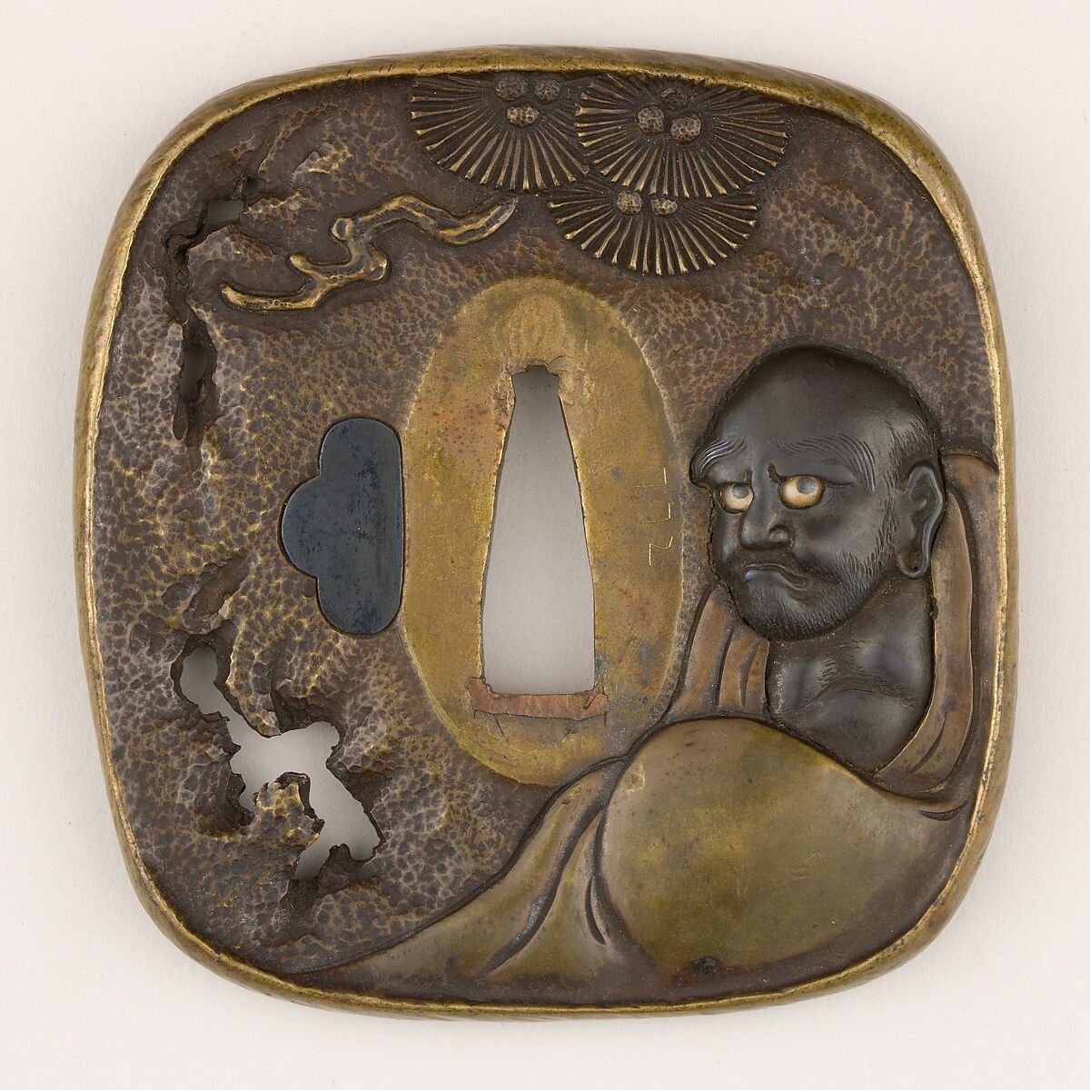 This thick sentoku tsuba shows on its obverse Bodhidharma (Japanese: Daruma) living in a cave, facing a wall for nine years, after being refused to join the Shaolin Monastery. In art history, this motif is referred to as Menpeki Daruma (面壁達磨). The surface of the plate is finished in a deliberately rough manner to represent the wall of the cave. The reverse shows a large pine which continues on the obverse.