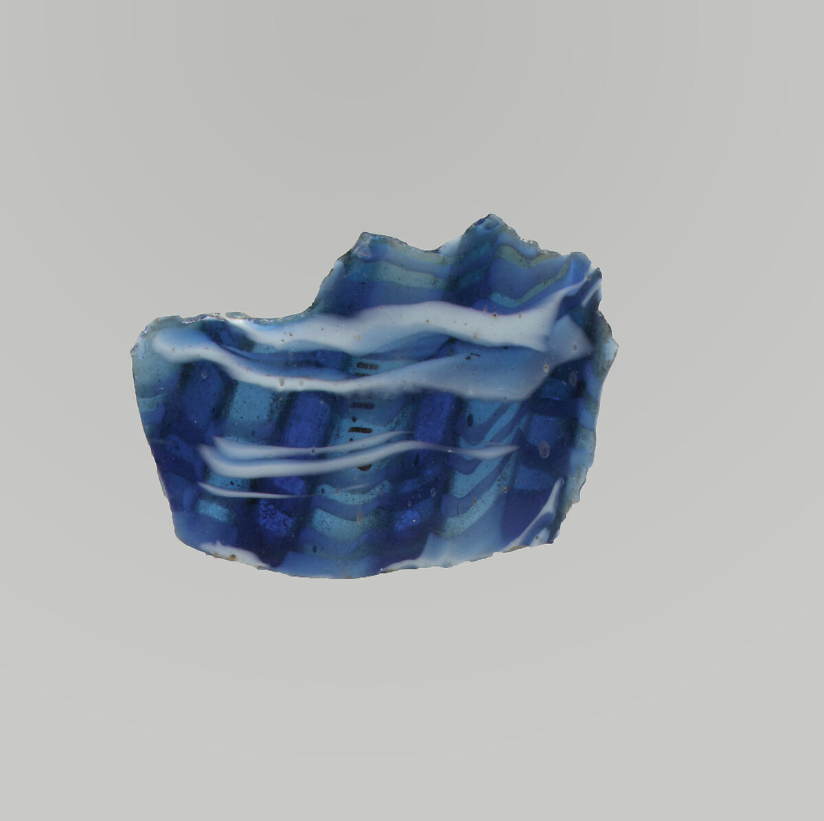 Ribbon mosaic pattern formed from lengths of a single cane in a blue ground with wavy, horizontal bands of white threads in parallel lines; on exterior, part of four vertical ribs with rounded exteriors, tapering downward.