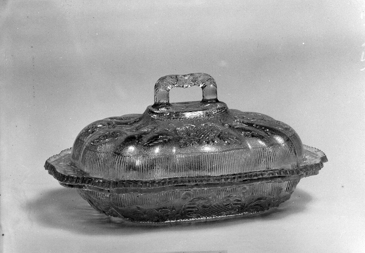 This vegetable dish with cover is pressed in "princess feather" medallions with a basket of fruit in the center of the basin and a grape border on the rim. A rose above a thistle pattern decorates the cover. The bottom of the dish was pressed in the same mold as compotes 57.131.14 and 57.131.15.