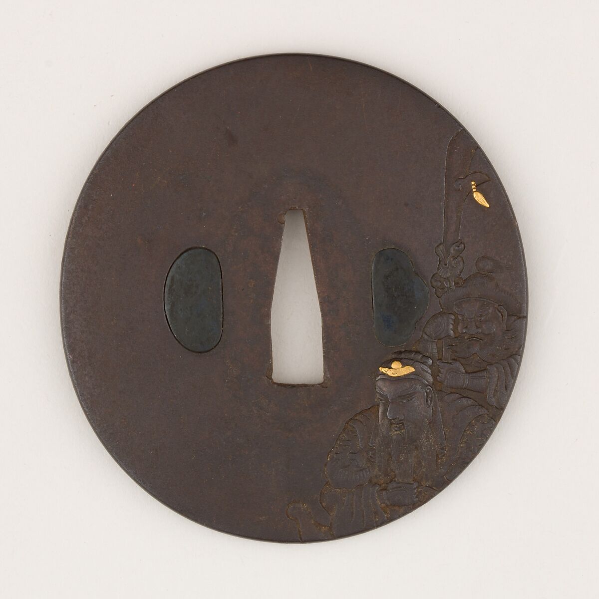 The obverse of this iron tsuba shows chancellor Zhūgě Liàng (181-234), courtesy name Kongming (Japanese: Kōmei,孔明 ), and general Guān Yǔ (?-201, Japanese: Kan’u, 関羽) with his famous halberd "Green Dragon Crescent Blade" (青龍偃月刀). The reverse is left undecorated. Both Zhūgě Liàng and Guān Yǔ are prominent figures of the Records of the Three Kingdoms, a Chinese historical text which covers the history of the late Eastern Han dynasty (ca. 184–220 A.D.) and the Three Kingdoms period (220–280 A.D.). As such Chinese classics were included in the curriculum of Japanese warrior education, relevant motifs frequently found on sword fittings.