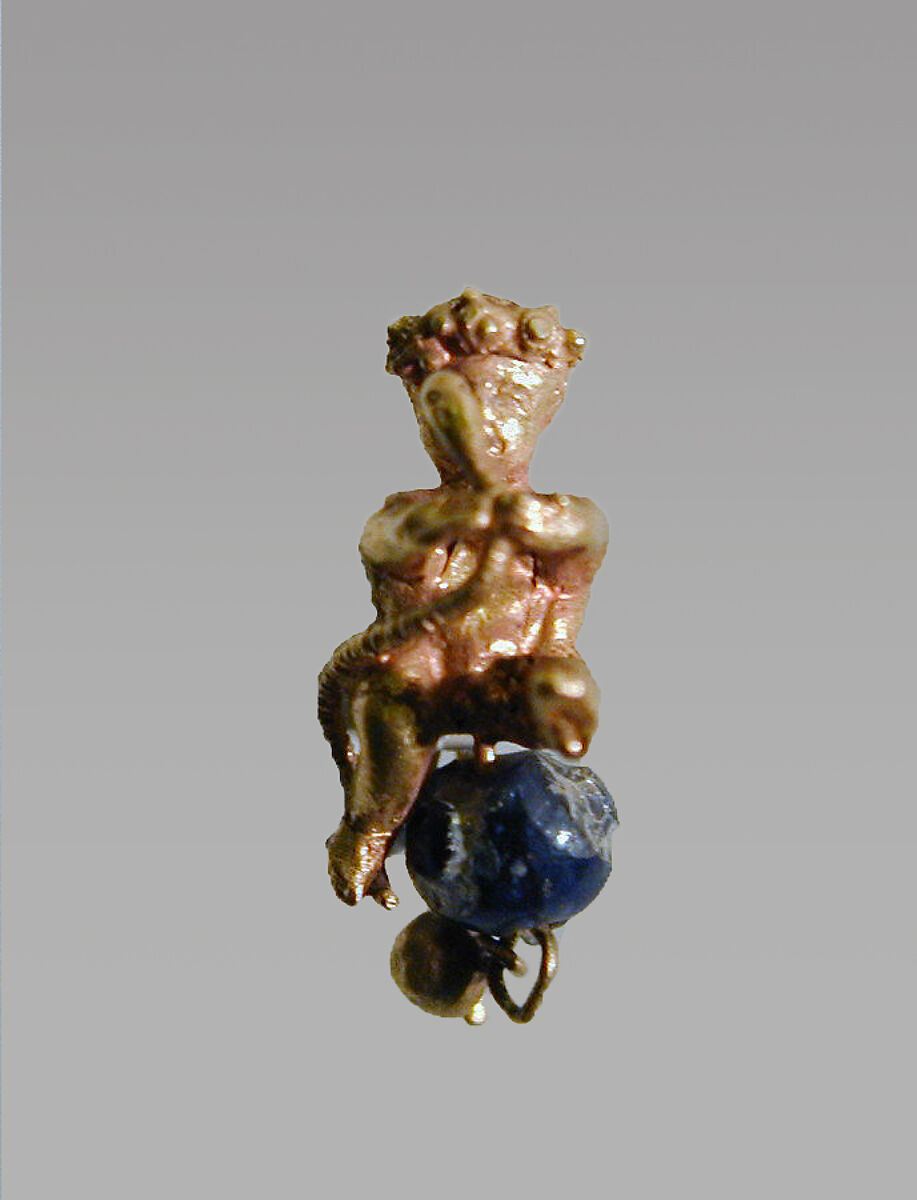 - Title: Pair of gold and glass earrings with baby Herakles
