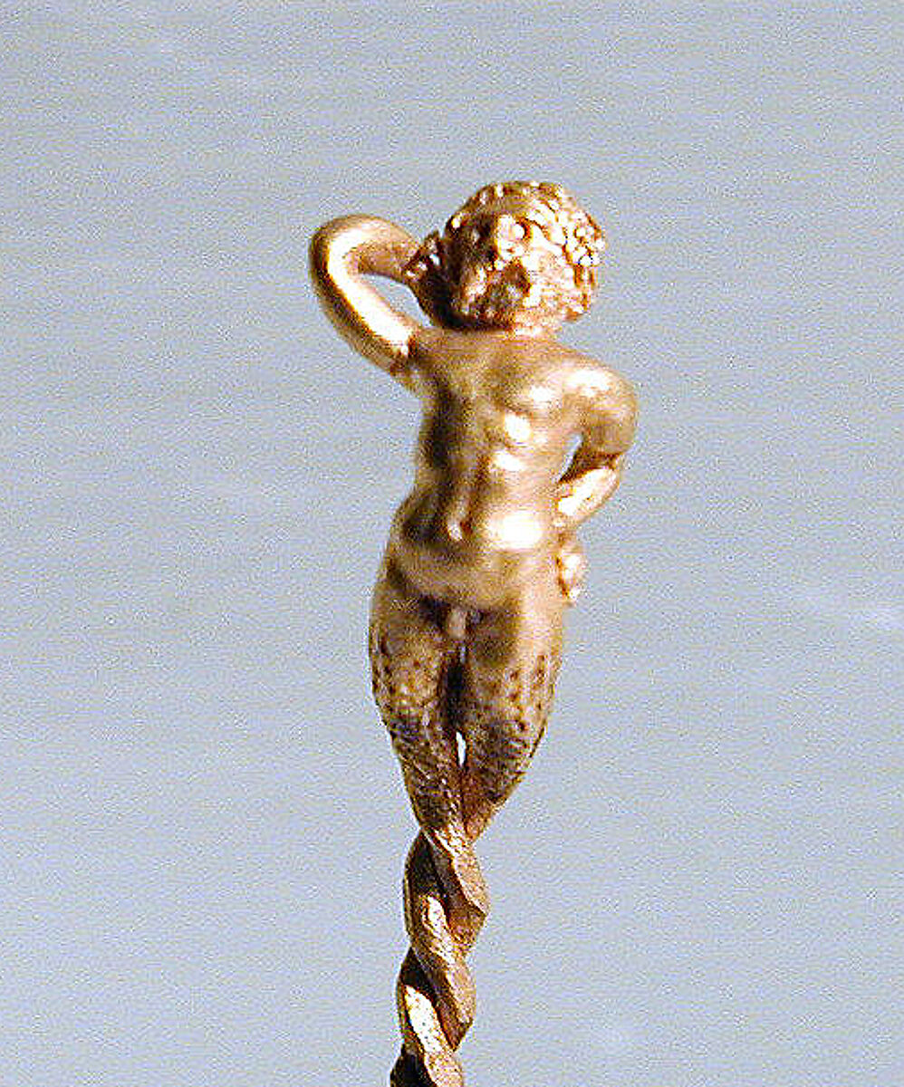 Hoop, now bent straight, of two wires twisted together, with finial in the form of a satyr whose legs, complete with hairy curls, emerge from the two wires of the loop. The satyr is naked, with his back arched; his left hand resting on his buttock, while his right is raised and bent back below his head, a leafy garland crowns his head.