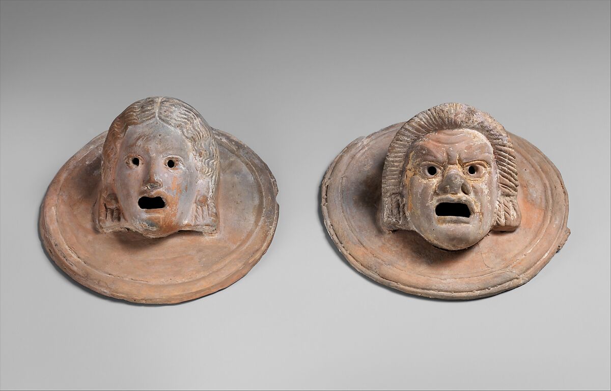 A pair of terracotta roundels with theater masks (hetaira and slave).