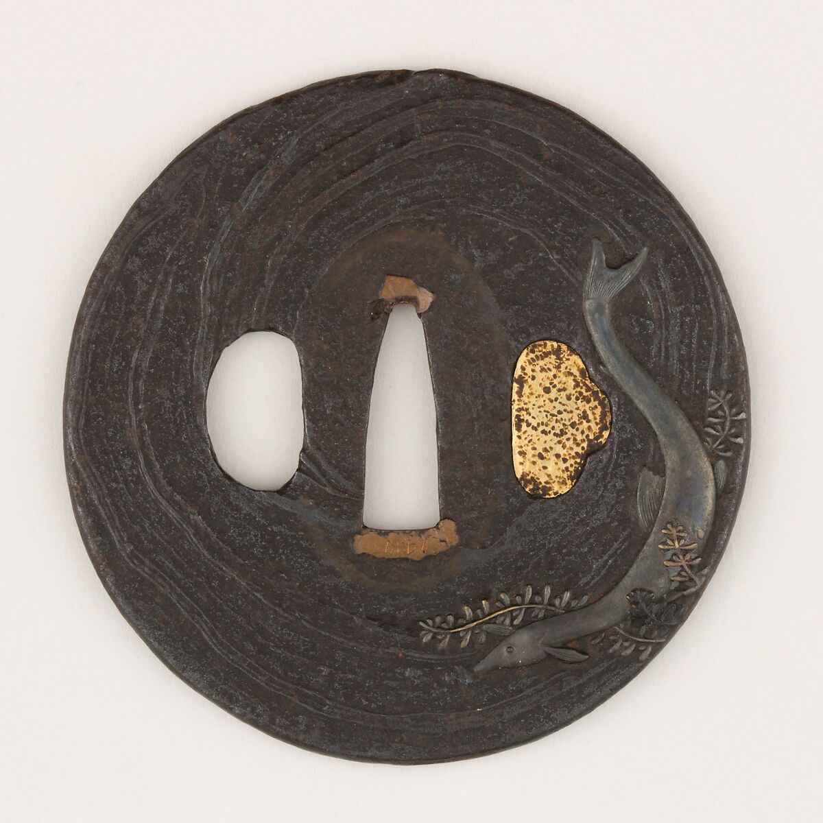 - Title: Sword guard (Tsuba) Depicting Icefish Between Seaweed (藻に白魚図鐔)