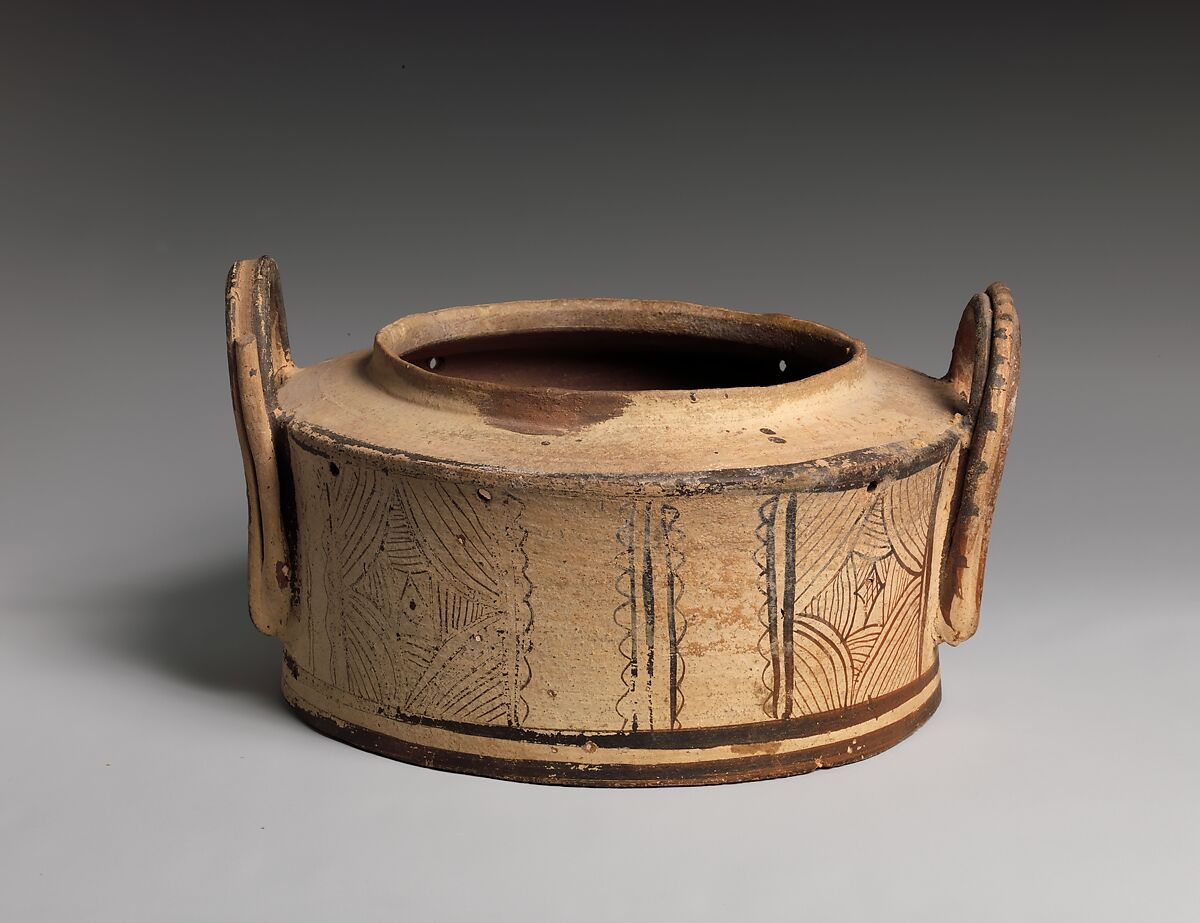 Most of the Minoan palace centers on Crete were destroyed around 1450 bce, marking the end of the Minoan influence on arts and crafts throughout the Aegean region. These sites were later occupied and rebuilt by Mycenaeans from mainland Greece, and pottery produced on Crete during this period reflects the introduction of new artistic styles and vessel shapes. While the painted decoration on pottery of Postpalatial Crete is not as fine as the earlier works produced in the palace workshops, the quality of potting and the pyrotechnology reached a high point. This pyxis is a variation of the characteristic Minoan type, which typically has a taller cylindrical body.