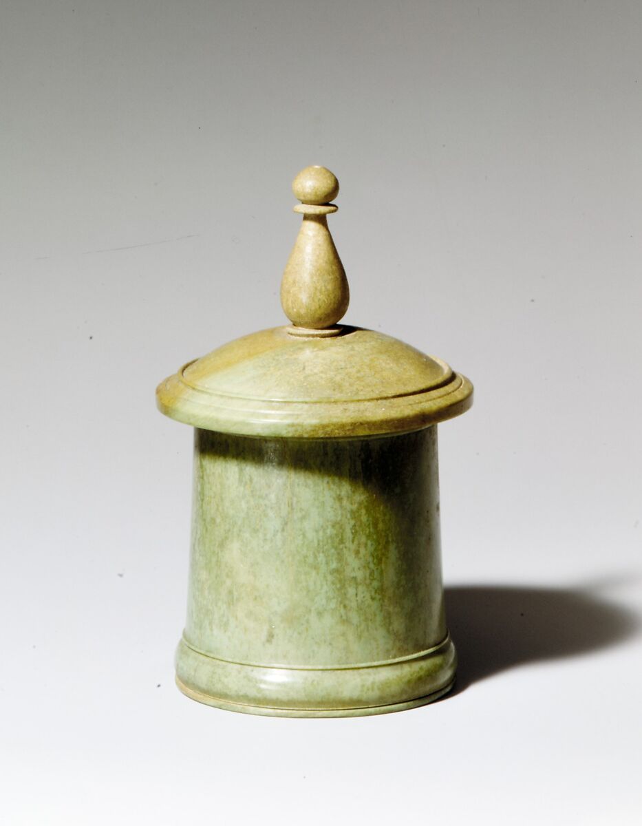 This finely carved bone pyxis probably formed part of a lady's cosmetic or trinket set. It may have been found in Rome, together with the rock crystal and silver spoon, 2000.1.
