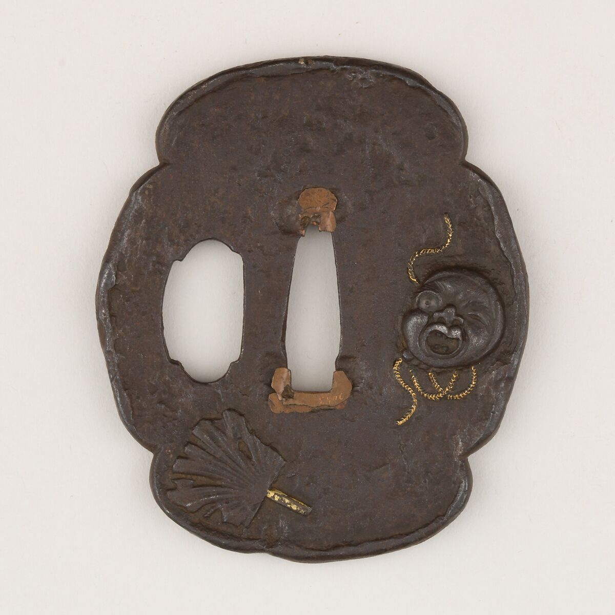 The obverse of this tsuba shows the relief of a Hyottoko mask and a broken fan and the reverse a closed fan. Hyotokko is a clown-like Japanese stock character which is potrayed through the use of a mask. He is depicted on this tsuba in the traditional way, i.e. with asymmetrical eyes and wearing a scarf around his head.
