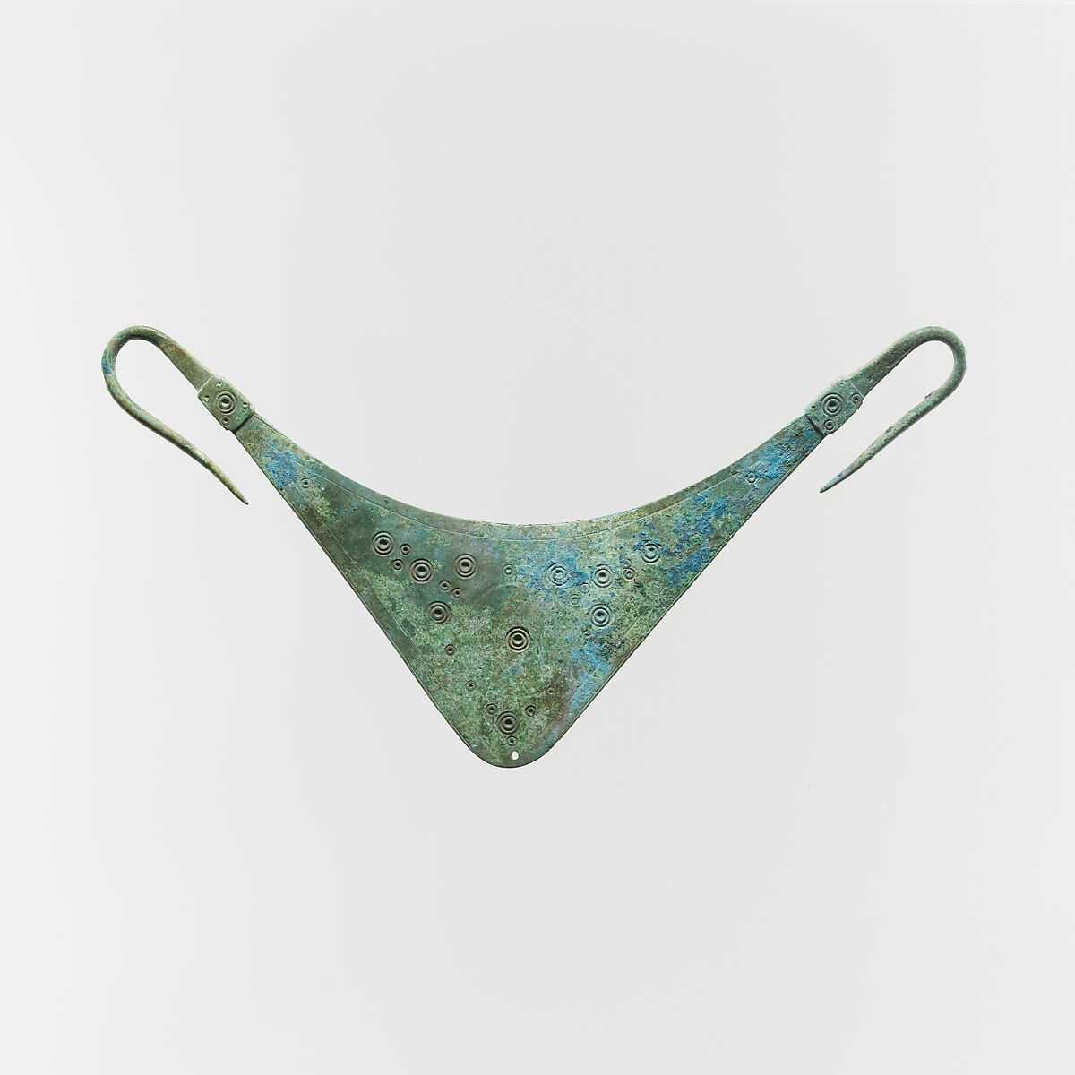 This artwork was restituted in September 2025. It is no longer in the museum’s collection.This type of personal ornament is characteristic of northern Greece, particularly Western Macedonia and Thessaly. The extraordinary delicacy and technical mastery in the execution of the triangles and concentric circles are especially noteworthy. A similar object was discovered in a woman’s tomb at Kozani (modern Greek province of Macedonia), placed on the body’s pelvis, indicating its function as belt clasp or hanger.