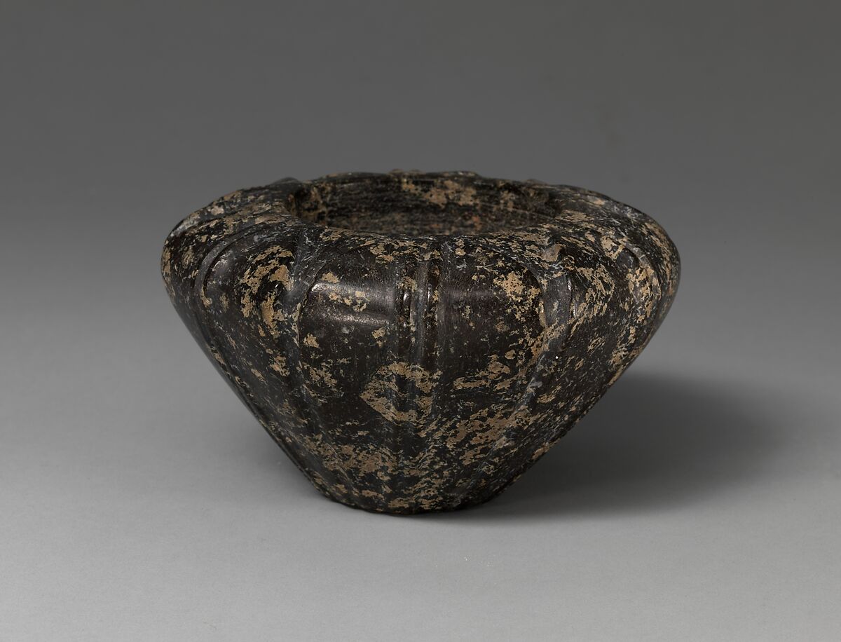 Minoan artists crafted vessels from a variety of stones using chisels, hammers, and copper-alloy saws. Finer tools like copper drills with abrasives were employed to hollow out their interiors. These vessels were durable versions of standard terracotta and metal forms, made with such high quality that they were exported throughout the Eastern Mediterranean. Stoneware has been found in settlements, cemeteries, and sanctuaries alike; the smallest examples were likely votive offerings. Particularly popular and long-lived forms are bird’s-nest (see 26.31.434 for example) and blossom bowls (such as this one), the latter perhaps imitating Egyptian lotus flowers in bloom. Both likely served as containers for ointments.