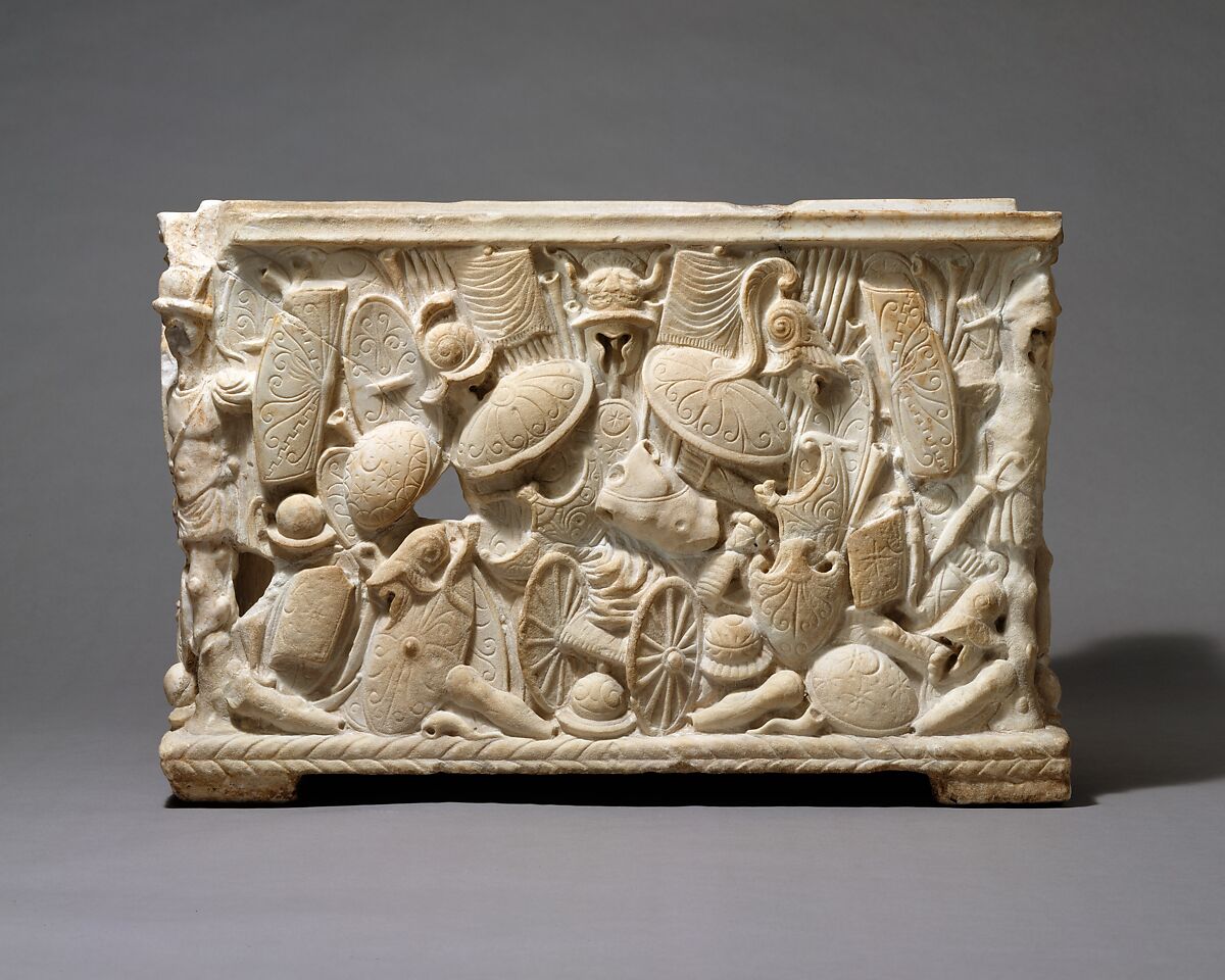 This Roman cinerary urn is highly unusual in having the spoils of war as its principal theme. Despite the fragmentary nature of the piece, the trophies and piles of weapons and armor that cover the back and sides of the rectilinear box are very striking. In both detail and composition, the panels are representative of high-quality workmanship, suggesting that the work was a special commission. Sadly, much of the front, where the inscription recording the name of the deceased would have been, is missing. The urn is said to have been excavated from a tomb near Anagni, southeast of Rome, in 1899.