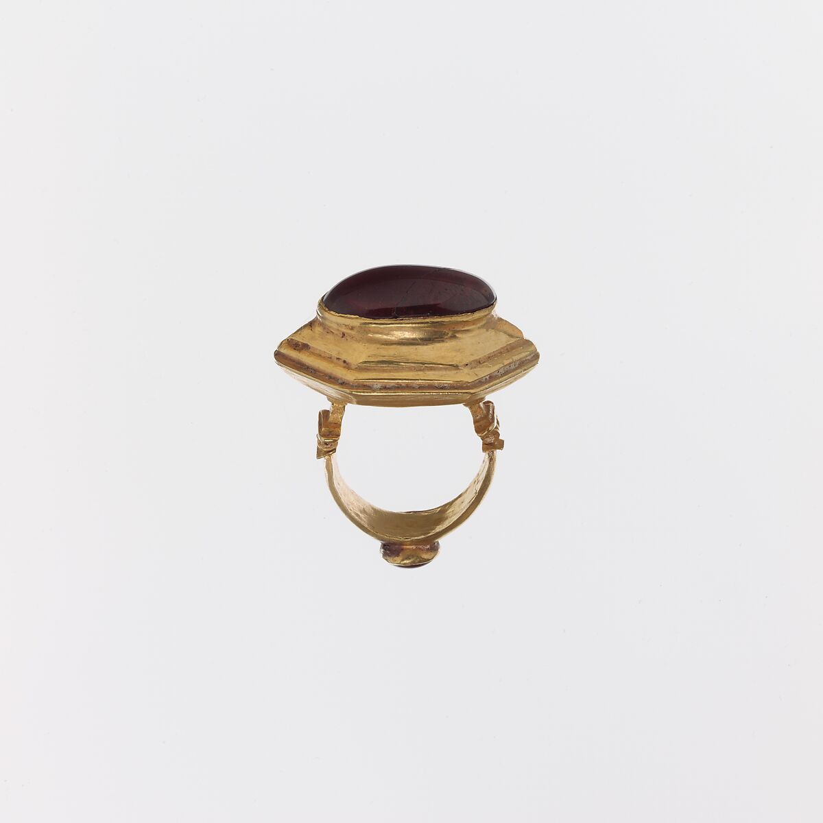 The size of the hexagonal bezel, set with a plain but impressively large oval garnet, combined with the fact that another smaller garnet is set in a circular bezel at the center of the hoop at rear, suggests that one was meant to wear this ring on the thumb. This interpretation is confirmed by the presence of the hinge mechanism on the hoop, which allowed the ring to be fitted securely onto the thumb below the knuckle. The piece is a striking example of the extravagant and ostentatious lifestyle of the rich in the Hellenistic world.